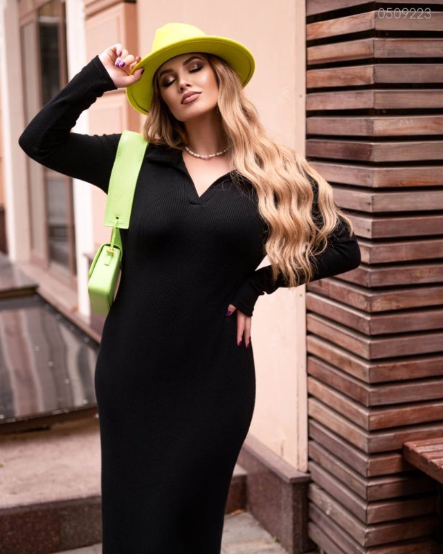 Деталі: Сукня довжини міді з відкладним коміром та довгим рукавом.