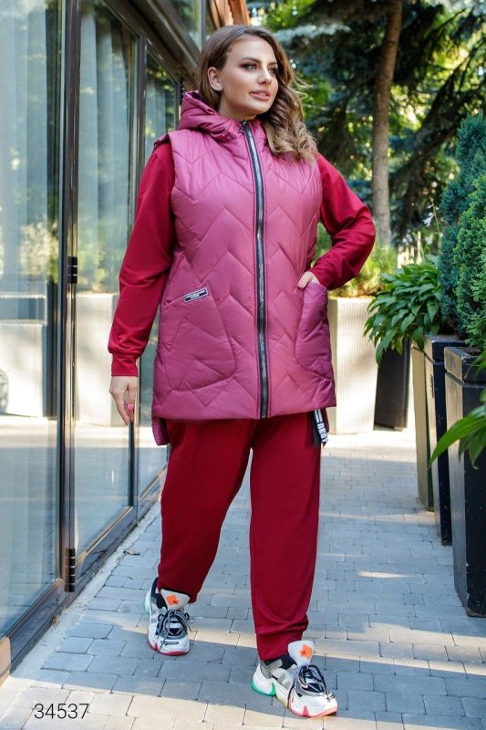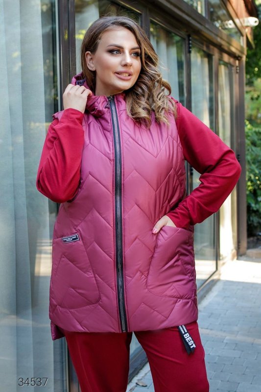 Стьобаний дутий жилет з плащової тканини на синтепоні. Об'ємний капюшон, накладні кишені, нашивка. Асиметричний нижній край з контрастними бічними лампасами, застібка на блискавку.
