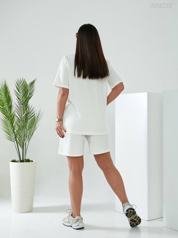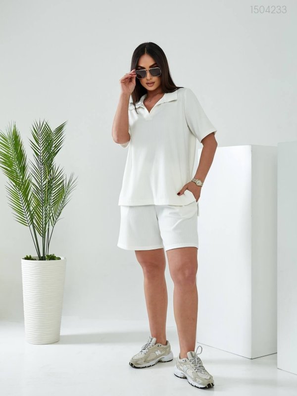 Детали: футболка с отложным воротником, V-образной горловиной, коротким рукавом. Шорты свободного кроя , высокой посадки, с поясом на широкой резинке.