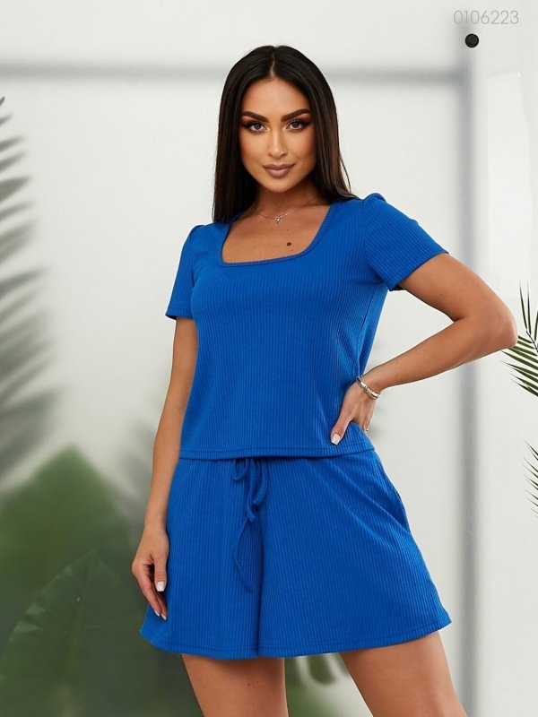 Подробности: футболка с округлой горловиной, коротким рукавом. Шорты высокой посадки на широкой резинке с кулиской, карманы в боковых швах.