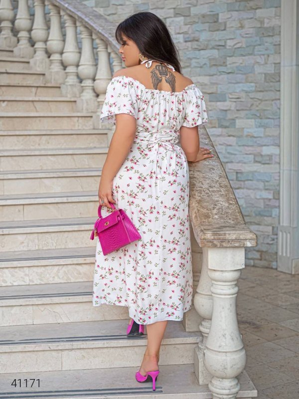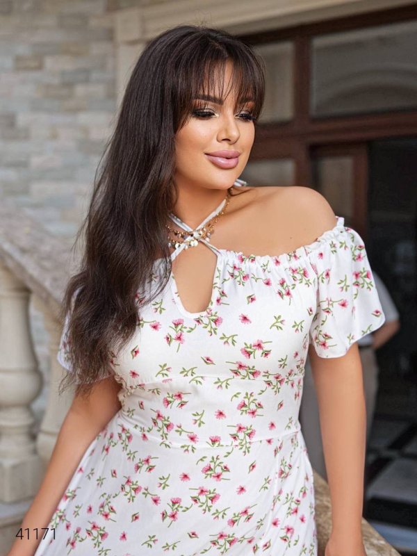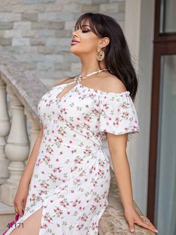 Летнее платье в цветочек. Платье можно моделировать: веревочки, расположенные в районе груди, можно завязать бантиком или сделать вырез декольте более глубоким. Сзади шнуровка – регулирует приталенность. Ткань: штапель.