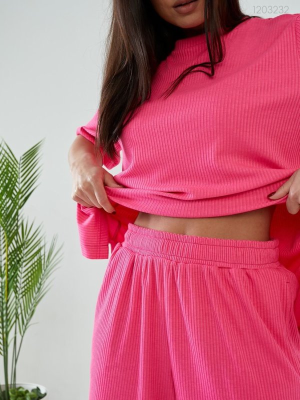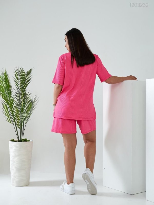 Детали: кофта А-силуэт, с округлой горловиной, и удлиненной спинкой. Шорты-бермуды свободного кроя с глубокими карманами на боковых швах и поясом на широкой резинке