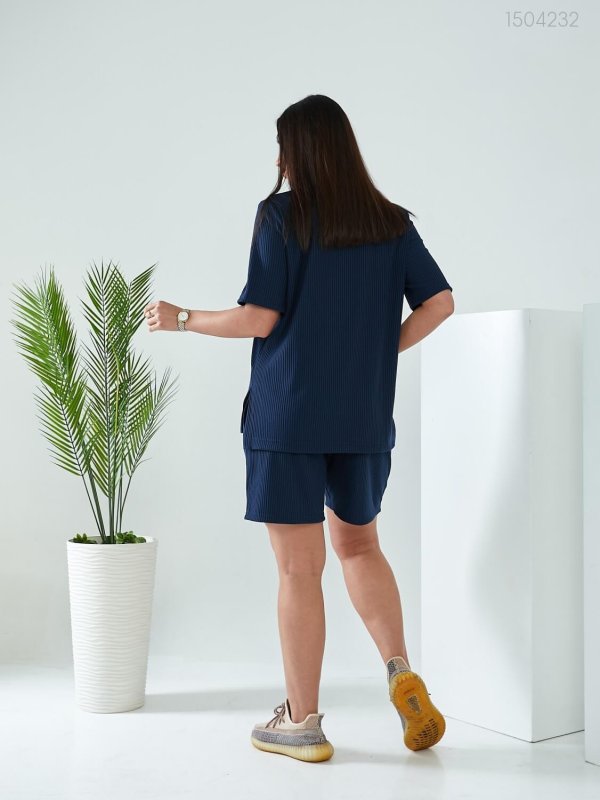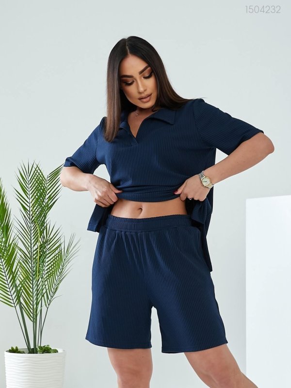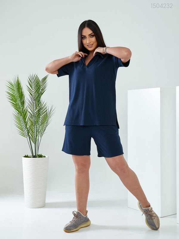 Детали: футболка с отложным воротником, V-образной горловиной, коротким рукавом. Шорты свободного кроя , высокой посадки, с поясом на широкой резинке.