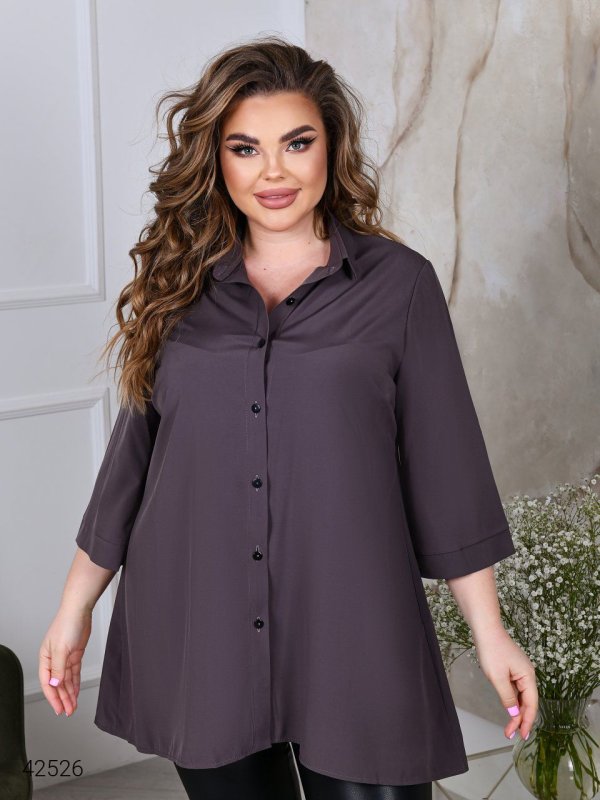 Женская рубашка больших размеров. Силуэт свободный, А-образный. Рукав широкий, прямой, длиной чуть ниже локтя.