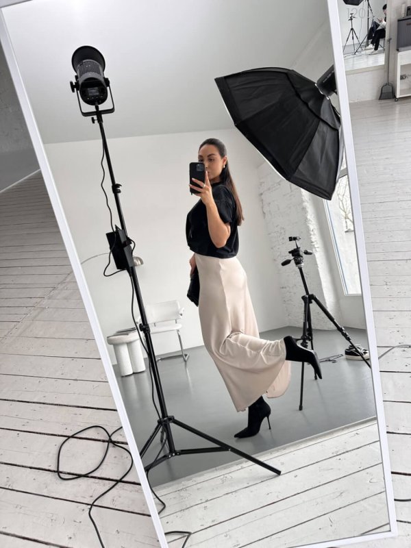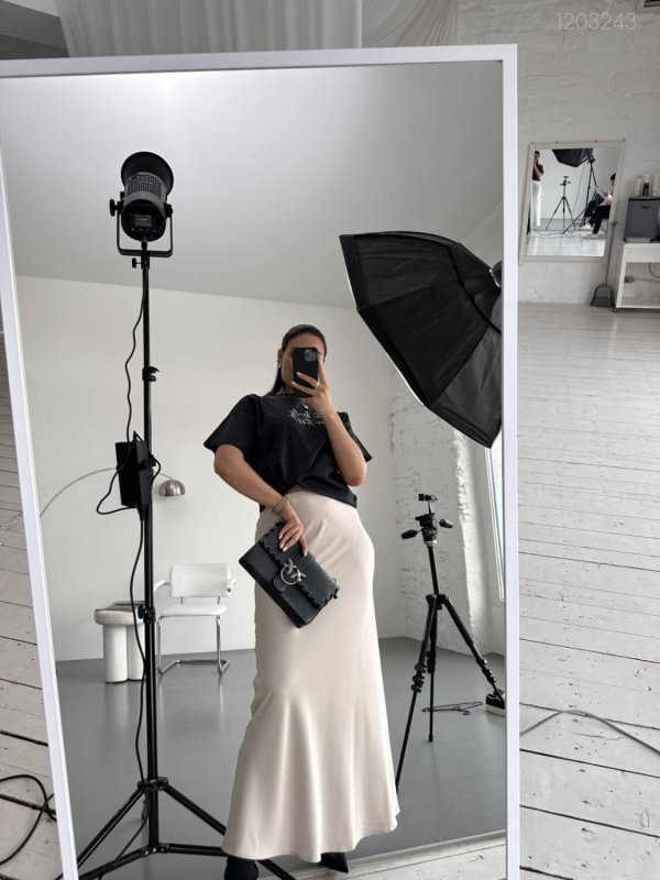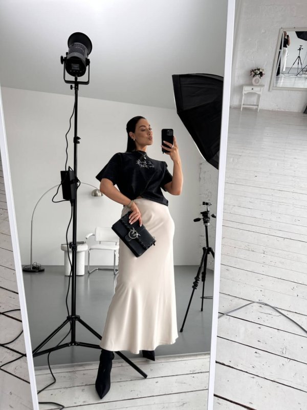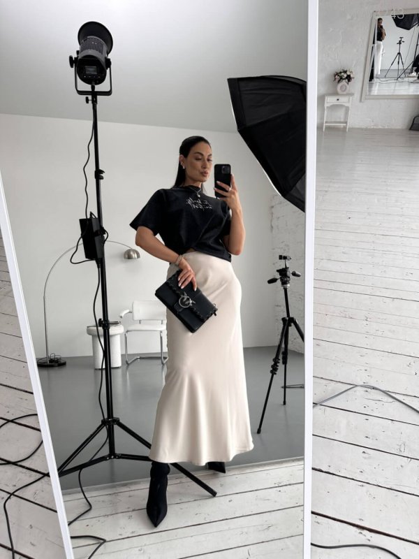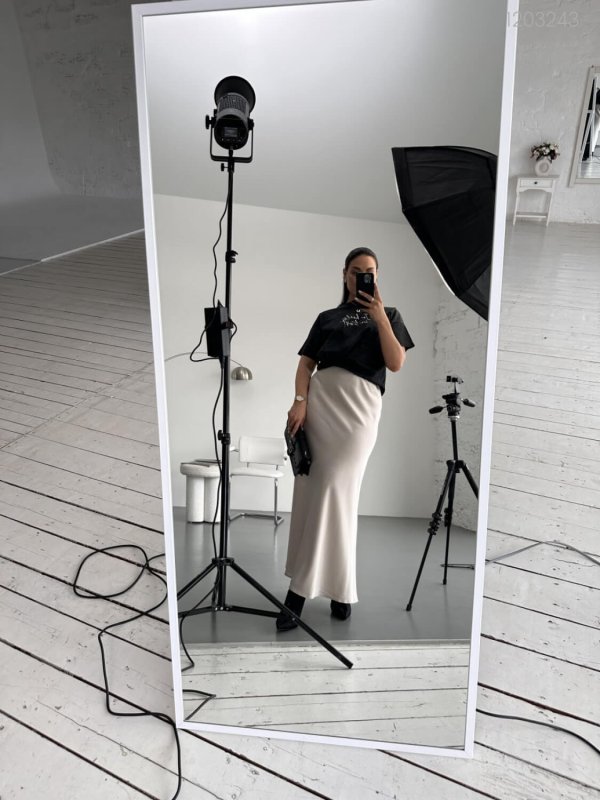 Деталі: спідниця покроєна по косій, за рахунок чого набуває форми тіла, з поясом на гумці, без кишень.