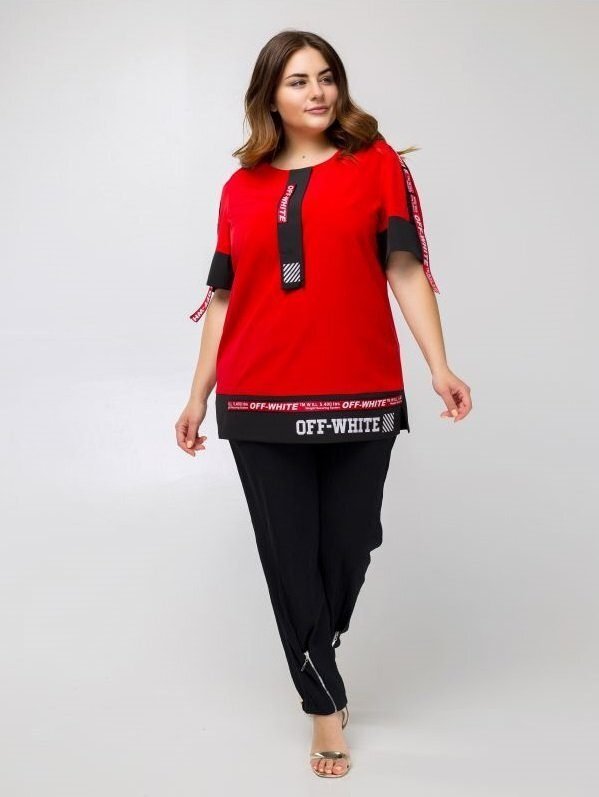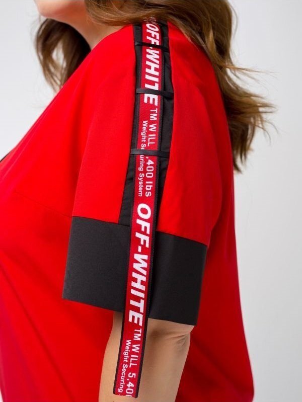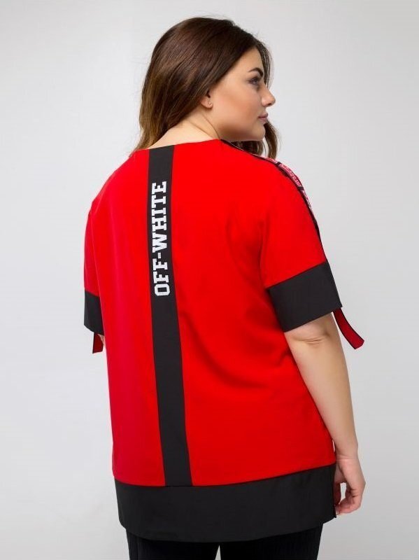 Блуза яскравого, насиченого кольору. Крій вільний, прикрашена контрастними смугами тканини і написами. Ефектна модель в стилі спорт-шик.
