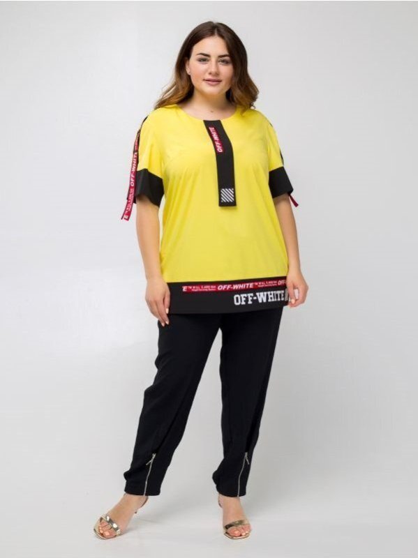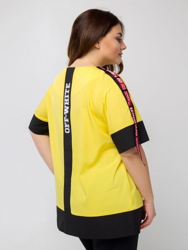 Блуза яскравого, насиченого кольору. Крій вільний, прикрашена контрастними смугами тканини і написами. Ефектна модель в стилі спорт-шик.