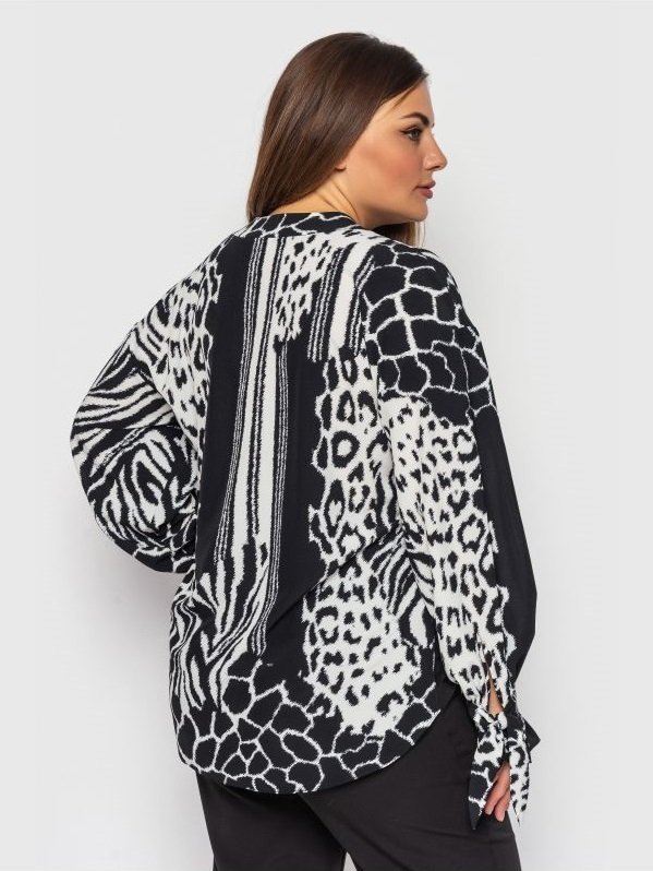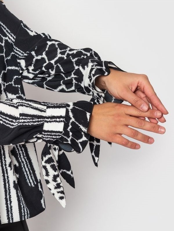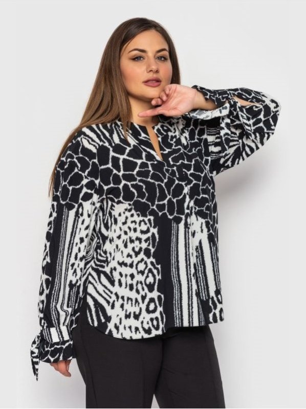 Легка і вільна блуза з анімалістичним принтом і V-подібним вирізом горловини. Рукава доповнені рюшів і вирізами на зав'язках. Спинка злегка подовжена, з боків розрізи.