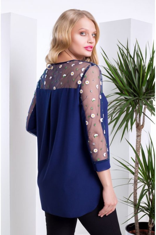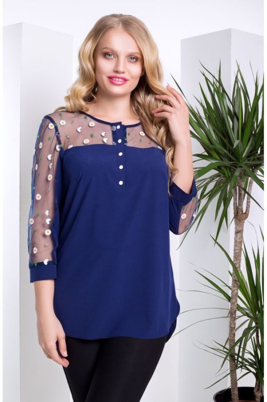Неймовірно ніжна і стильна жіноча блуза Сінді володіє комфортним кроєм, не стесняющим рухів. Кокетку і рукава блузки прикрашає сітка з вишивкою. Застібається на поличці на декоративні гудзики. Рукава доповнені невеликими манжетами, спинка злегка подовжена, з боків неглибокі надрізи.