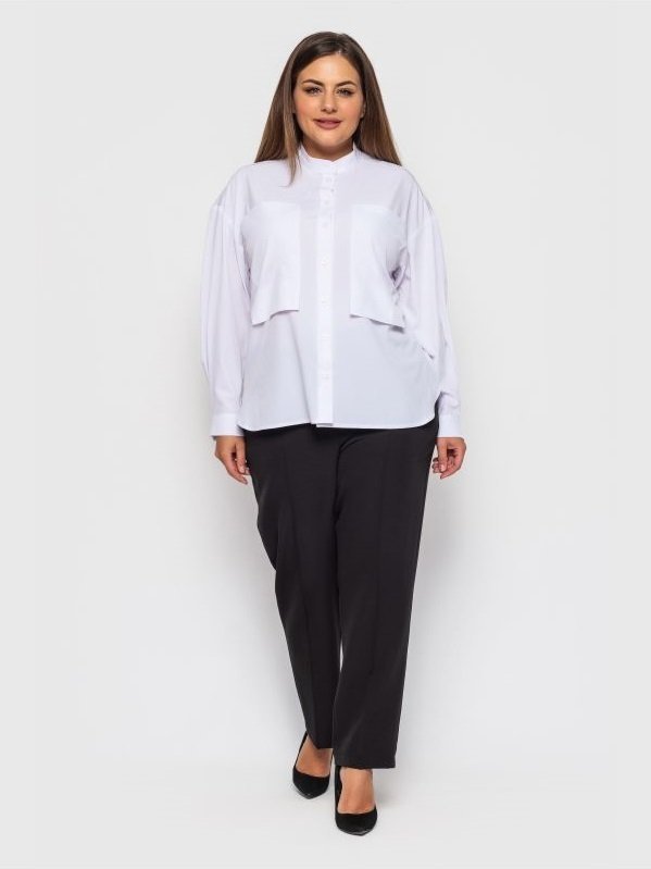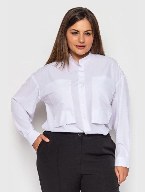Класична блуза вільного крою з актуальними в цьому сезоні накладними кишенями. Комір-стійка, блуза застібається на гудзики. Доповнена модель тасьмою "кучінеллі" по плечах. Манжети рукавів застібаються на гудзики. Спинка злегка подовжена, з боків фігурні вирізи.