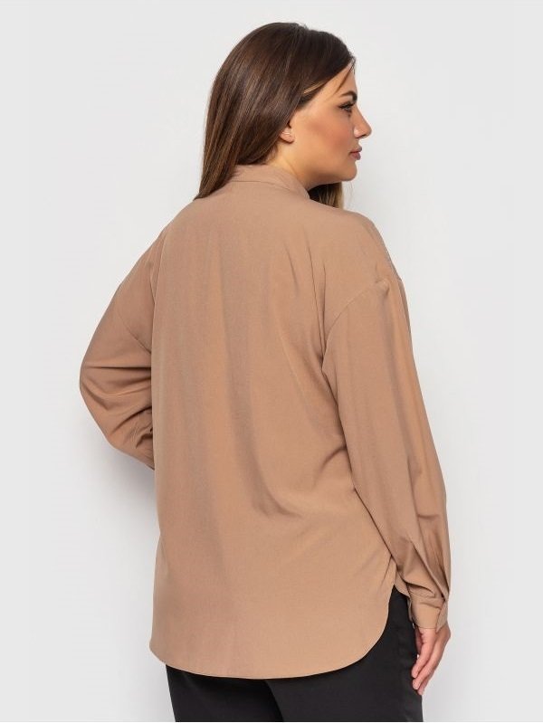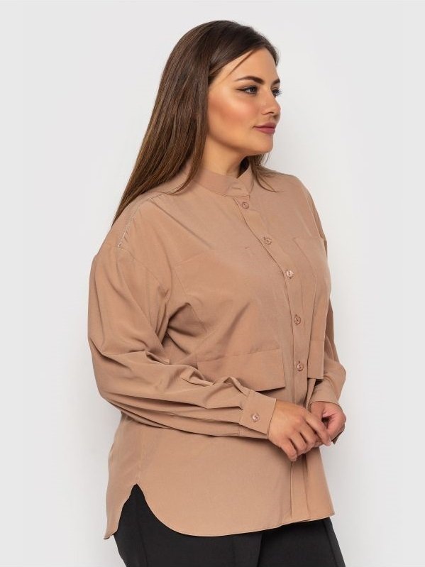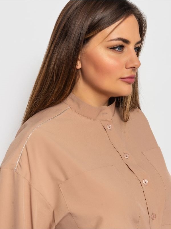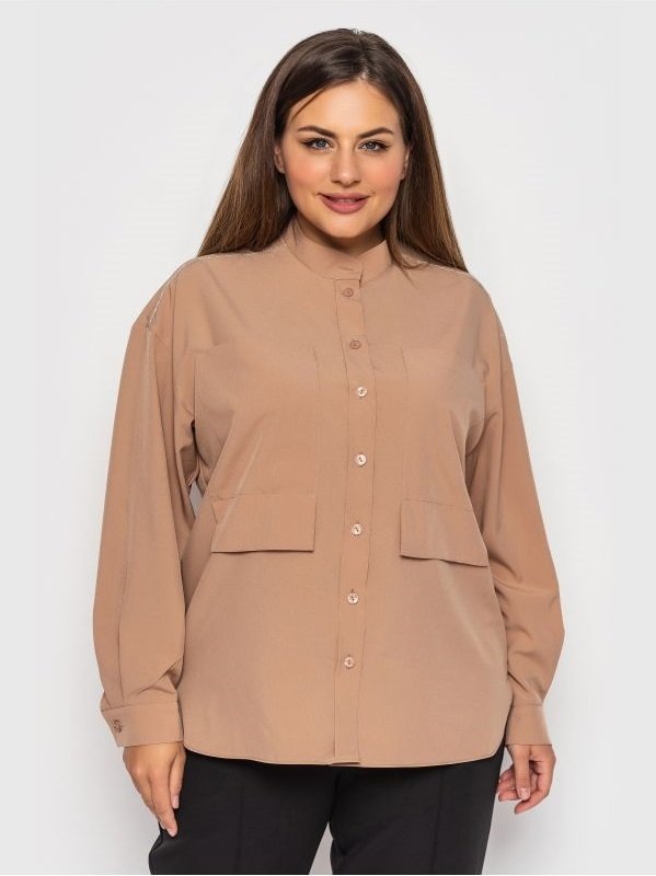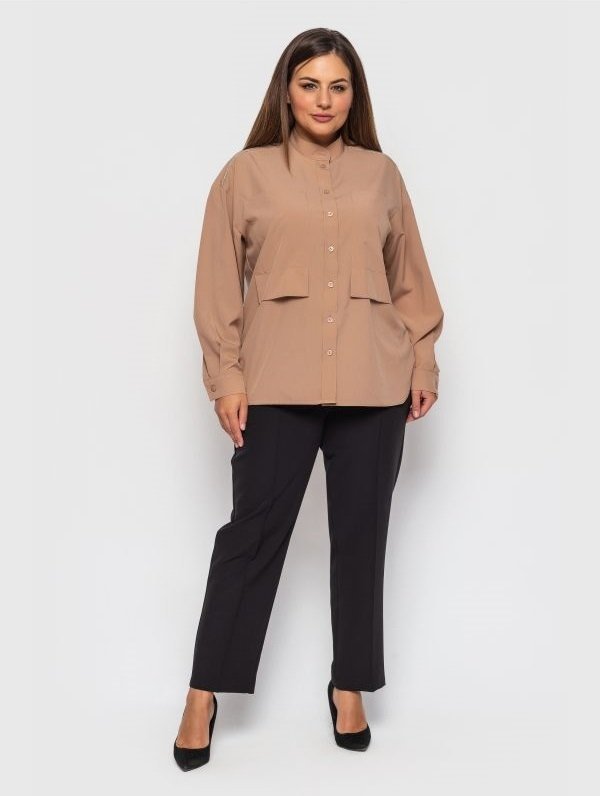 Класична блуза вільного крою з актуальними в цьому сезоні накладними кишенями. Комір-стійка, блуза застібається на гудзики. Доповнена модель тасьмою "кучінеллі" по плечах. Манжети рукавів застібаються на гудзики. Спинка злегка подовжена, з боків фігурні вирізи.