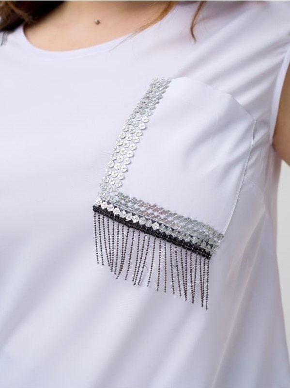 Легка, красива блуза Вейла вільного крою з накладною кишенею на поличці. Оформлена паєтками і декором з дрібних намистин. Спинка злегка подовжена, з боків розрізи.