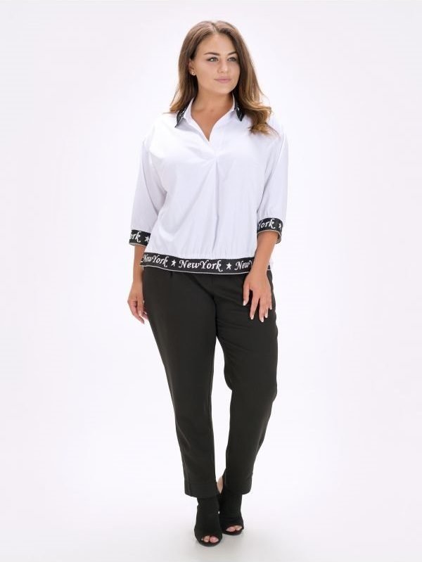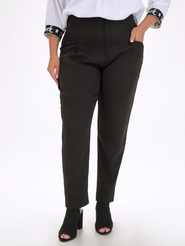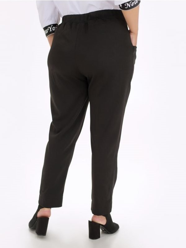 Штани завужені донизу високої посадки. Притачной пояс, ззаду-еластична вставка. Застібаються на гудзики і блискавку. Горизонтальні бічні кишені. Попереду на манжеті еластична вставка.