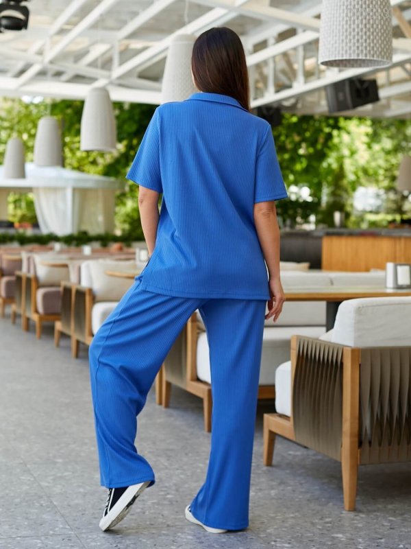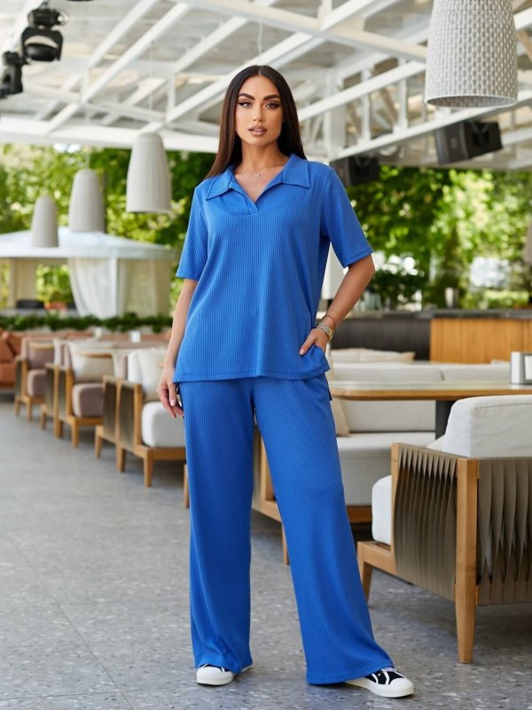 Деталі: подовжена футболка-поло вільного крою та рукавом до ліктя. Штани-палаццо на широкій гумці, з глибокими кишенями.