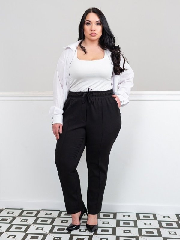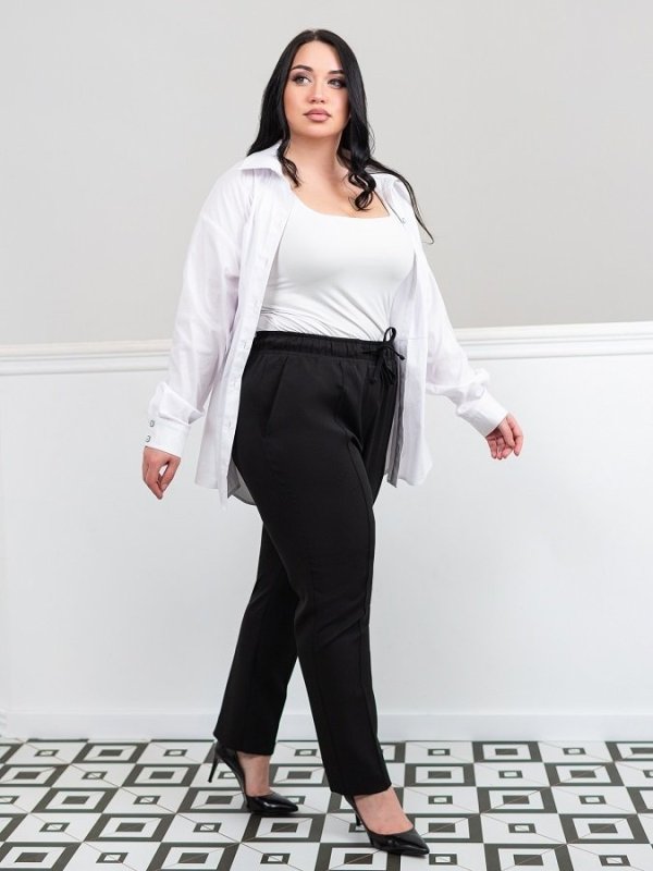 Легкі класичні брюки зі стрілками. Висока посадка, завужені до низу. Притачной прогумований пояс на зав'язках. З боків косі кишені.