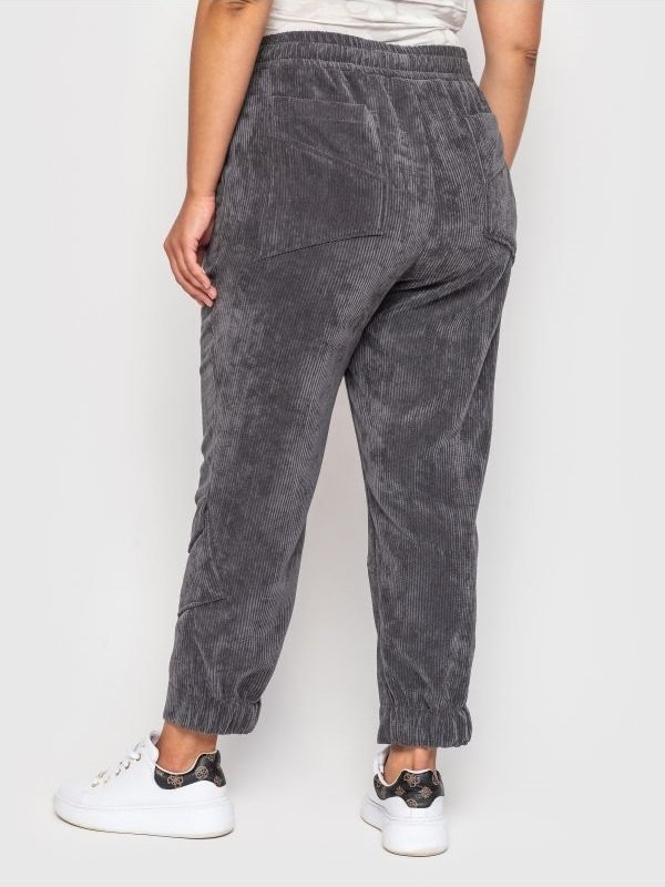 Стильні укорочені брюки високої посадки. По талії проходить широкий пояс на гумці, з боків косі кишені. Ззаду передбачені накладні кишені. На брюках є декоративні строчки і накладна кишеня з клапаном. Ззаду манжета брюк на гумці, що гарантує їх щільне прилягання до ноги.