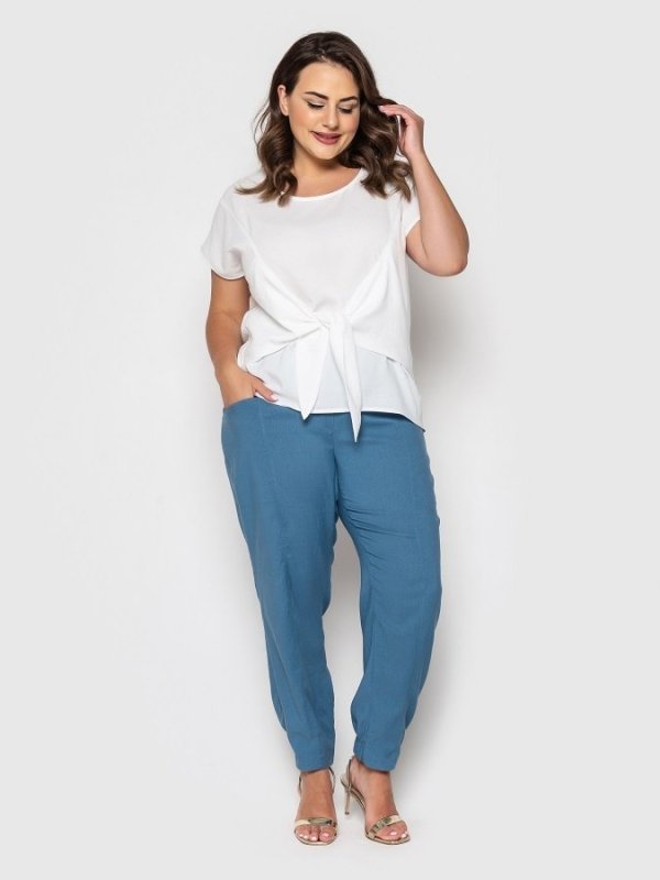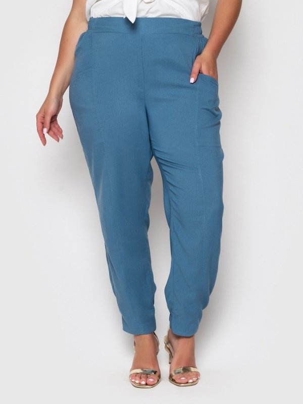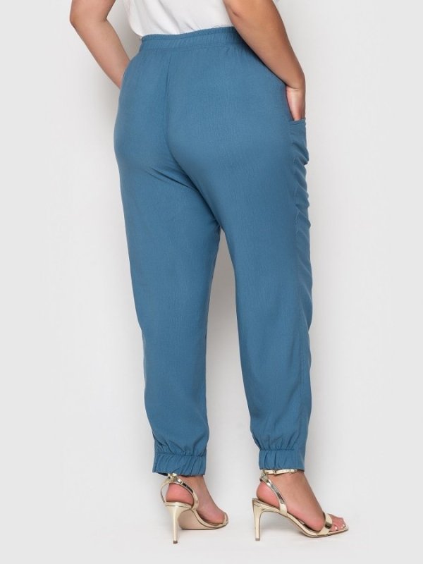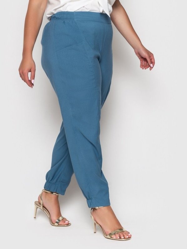Легкі літні штани високої посадки завужені донизу. По спинці пояса-еластична вставка. Ззаду манжет оформлений еластичною вставкою. Горизонтальні бічні кишені.