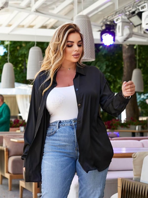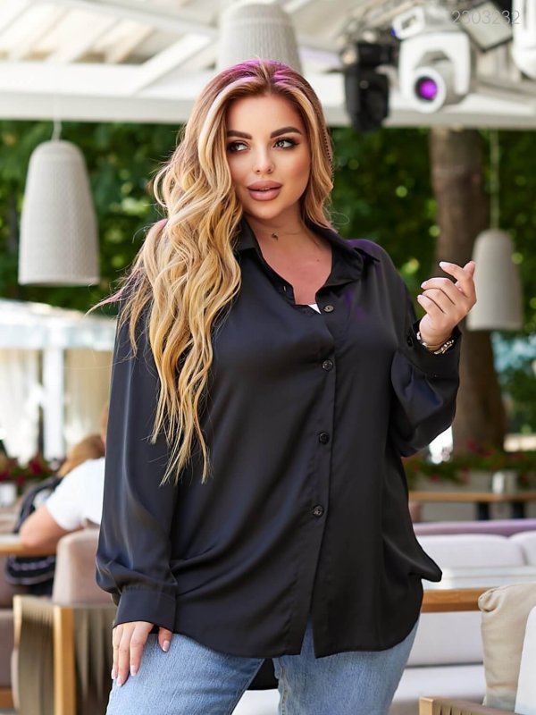 Подробиці: подовжена блуза вільного крою з коміром, заниженою лінією плеча, довгим рукавом з манжетою на гудзику.