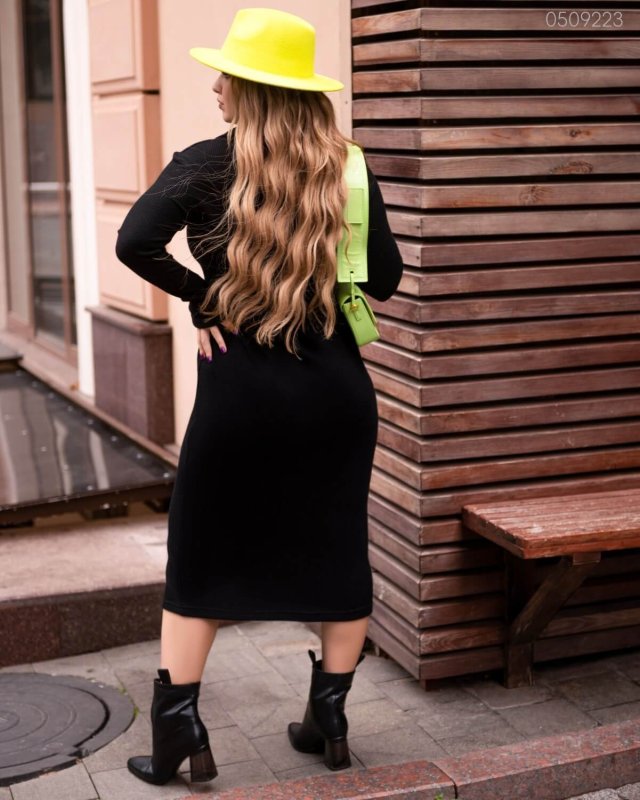 Деталі: Сукня довжини міді з відкладним коміром та довгим рукавом.