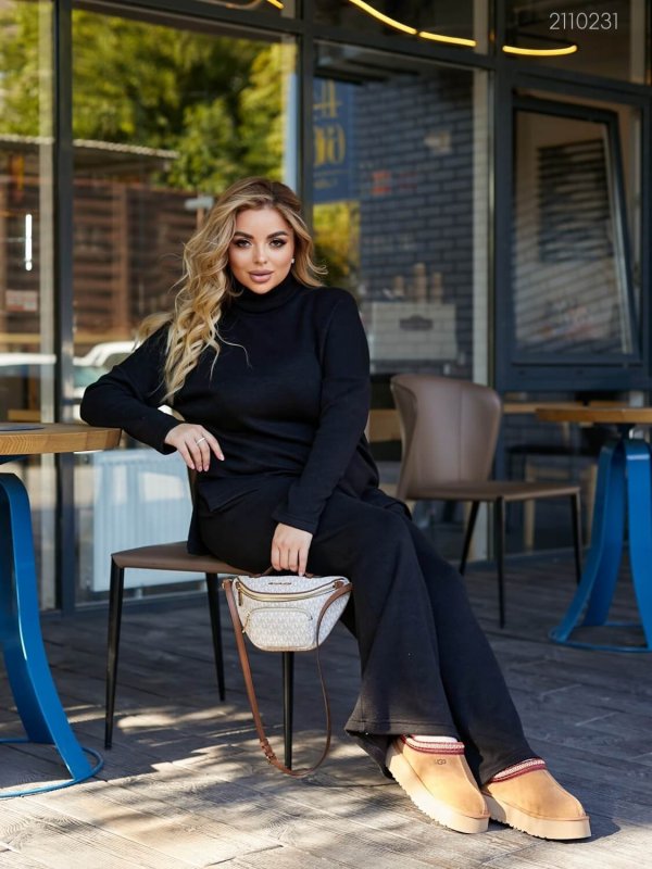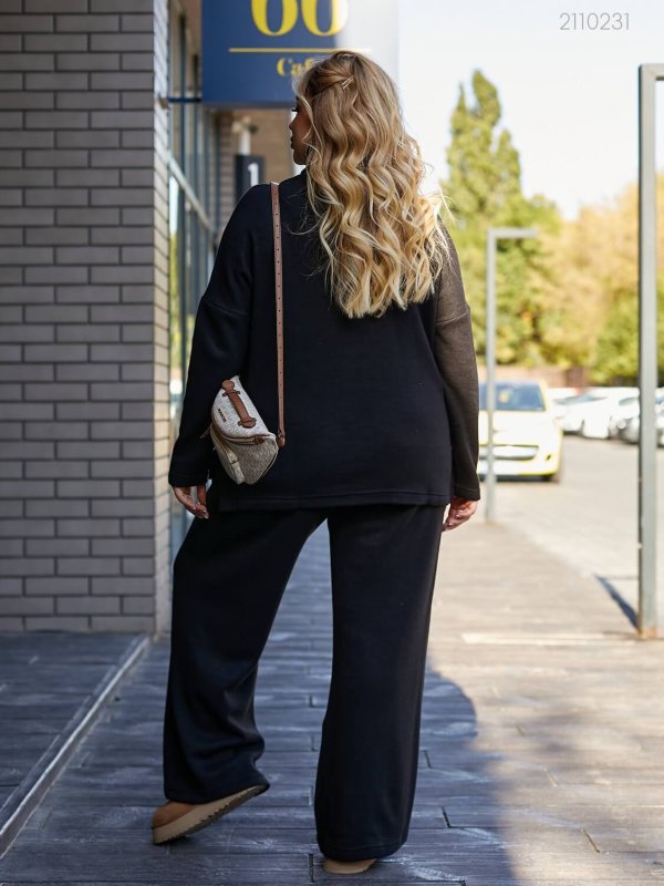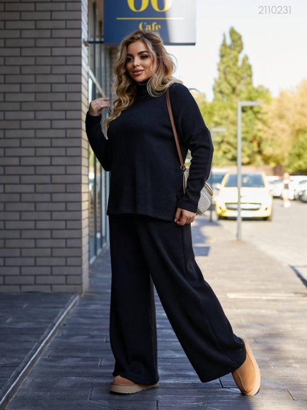 Деталі: кофта з високим подвійним коміром, спущеною лінією плеча, асиметричною довжиною. Штани-палаццо високої посадки з глибокими місткими кишенями, поясом на широкій гумці.