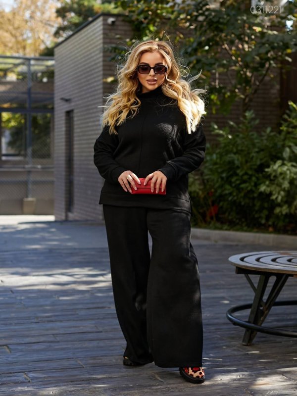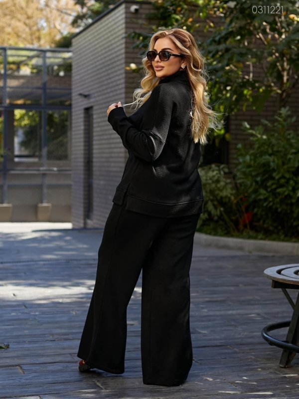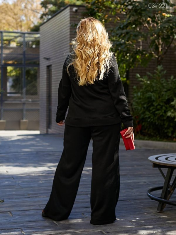 Деталі: кофта вільного крою, з розрізами з бічних швів. Штани-палаццо високої посадки, з поясом на широкій гумці, глибокими місткими кишенями.