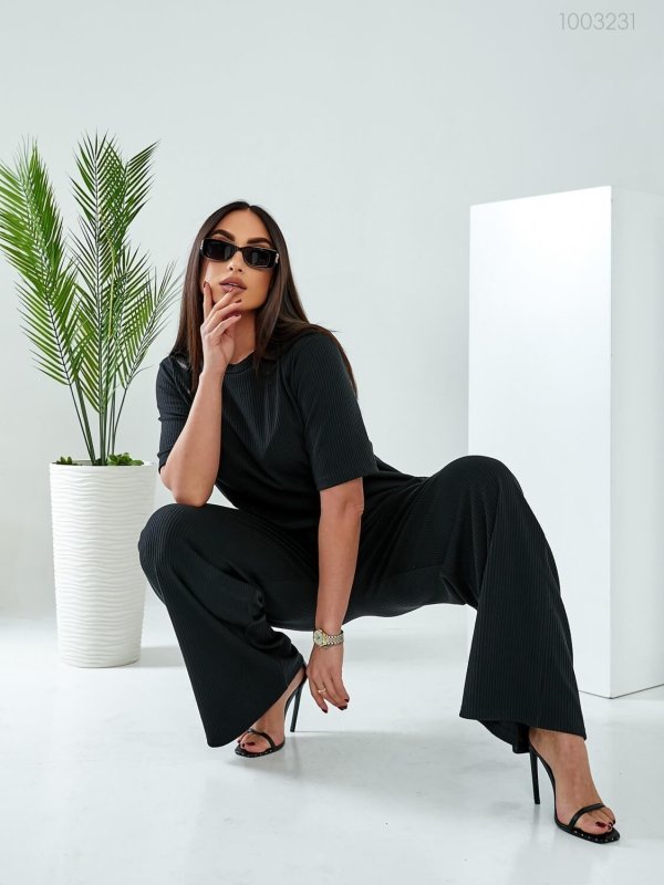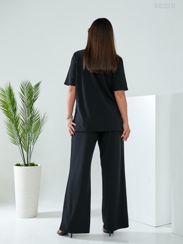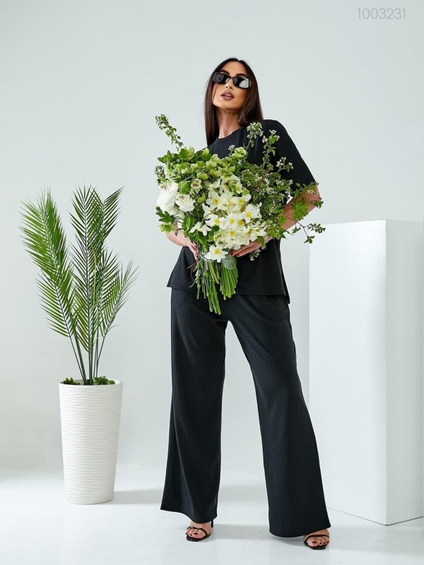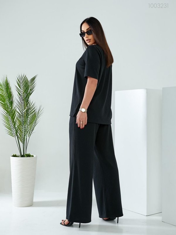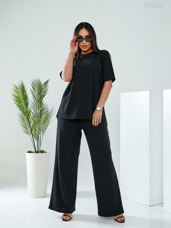 Деталі: довга футболка вільного крою з округлою горловиною та рукавом до ліктя. Штани-палаццо на широкій гумці, з глибокими кишенями.