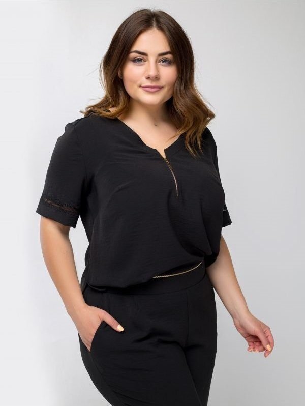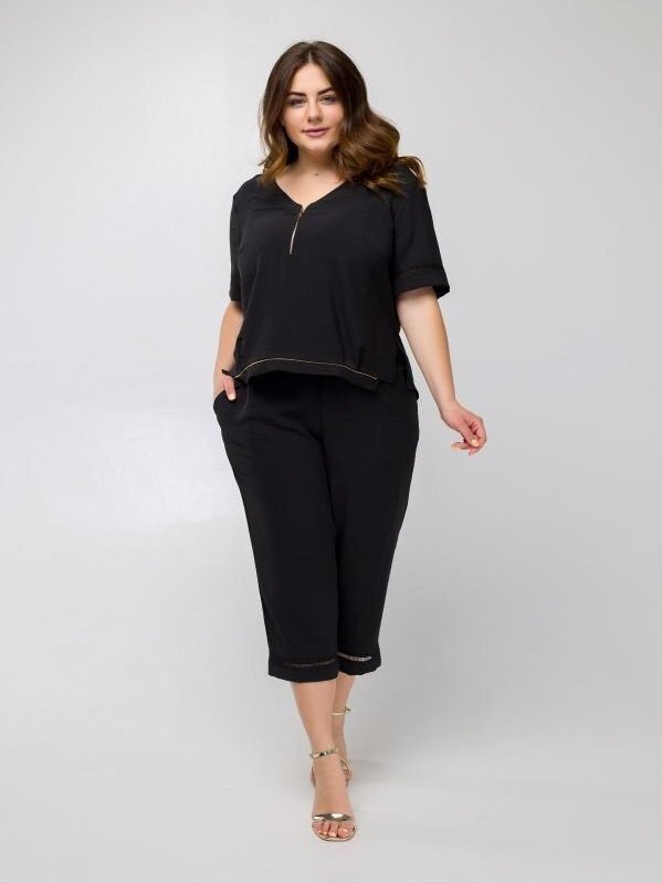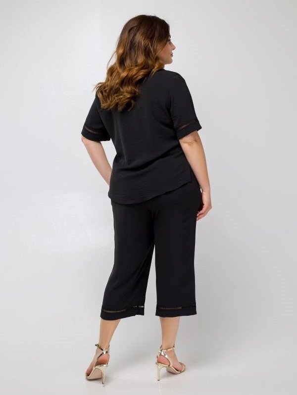 Жіночий комбінезон-трансформер Денмарк вільного, комфортного силуету. Поділяється на два самостійних вироби за допомогою блискавки по переду. Блуза з центральною застібкою - блискавкою, розрізи з боків. Штани-кюлоти з косими кишенями з боків і защипами від лінії талії. Спинка пояса виконано з гумки. Декорований виріб мереживний тасьмою.
