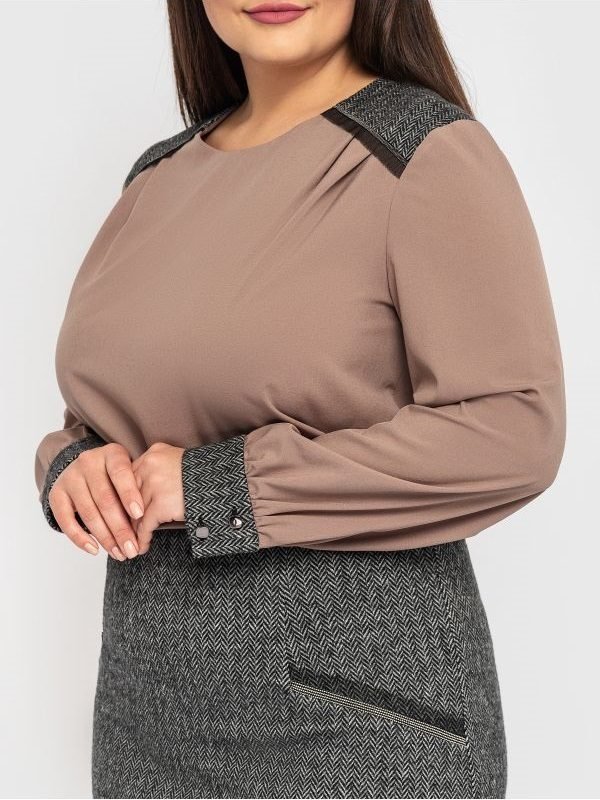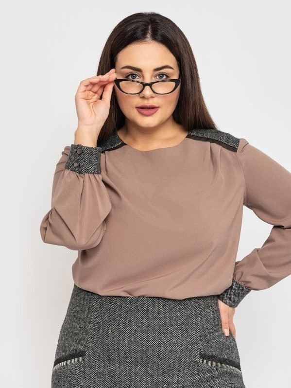 Блуза вільного крою зі злегка подовженою спинкою і розрізами з боків. На плечах і манжетах вставки з окантовкою з декоративної тасьми. Манжети застібаються на декоративні гудзики. Застібка по центру спинки-декоративний гудзик.