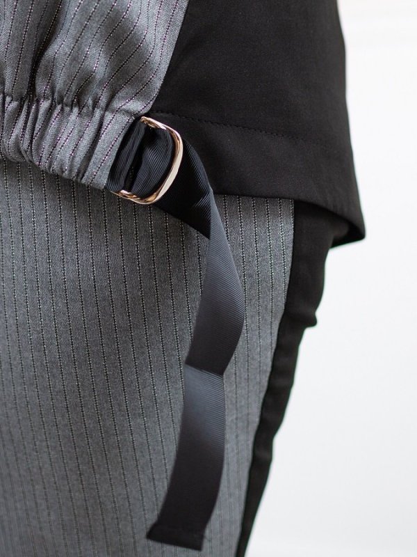 Ефектний брючний костюм з комбінації двох тканин. Перед виконаний з матеріалу з незначним включенням ниток люрексу.