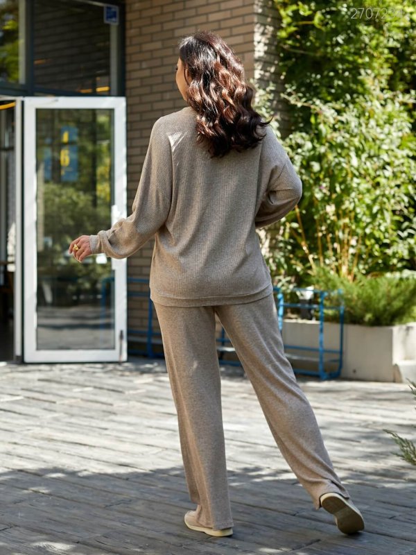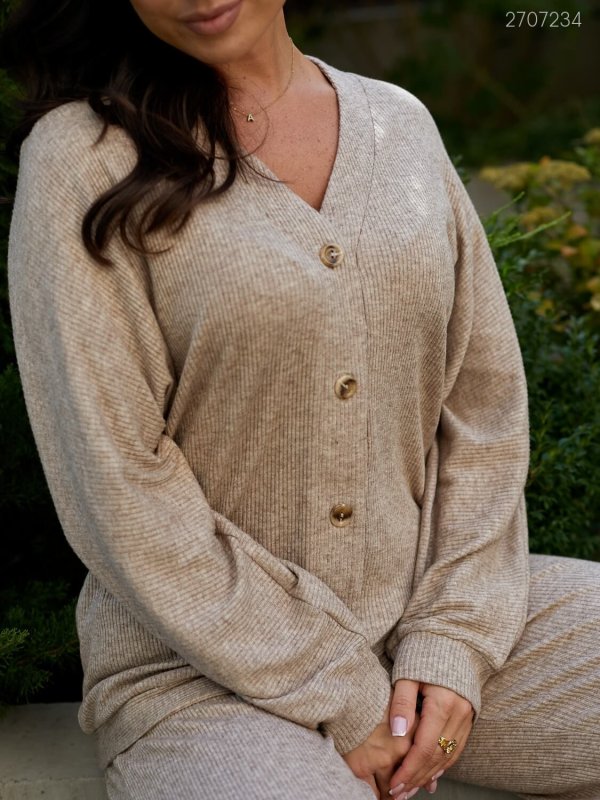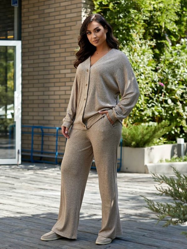Кардиган вільного крою із застібкою на ґудзиках. Штани-палаццо з поясом на широкій гумці з кишенями в бічних швах.