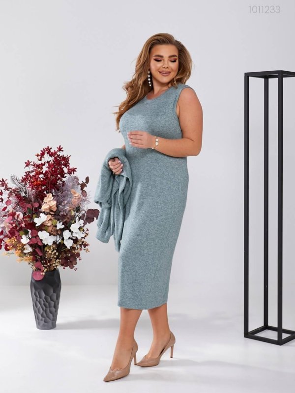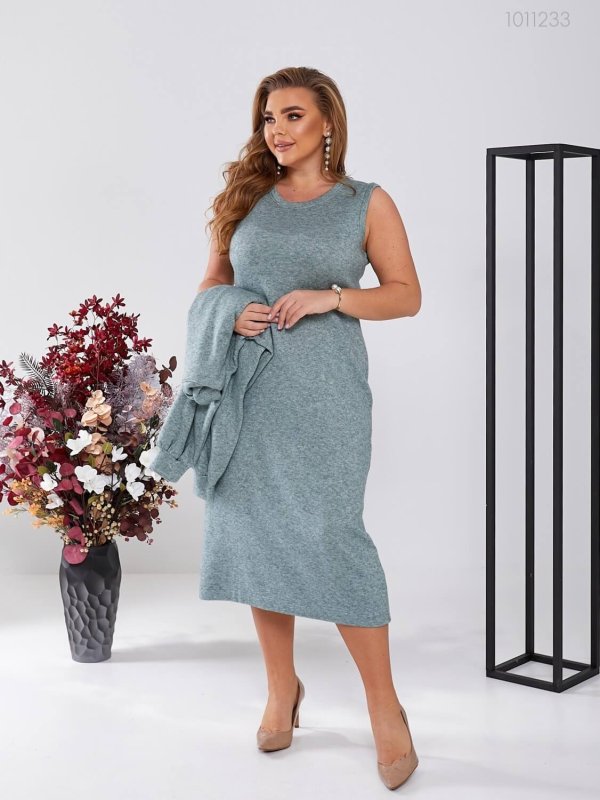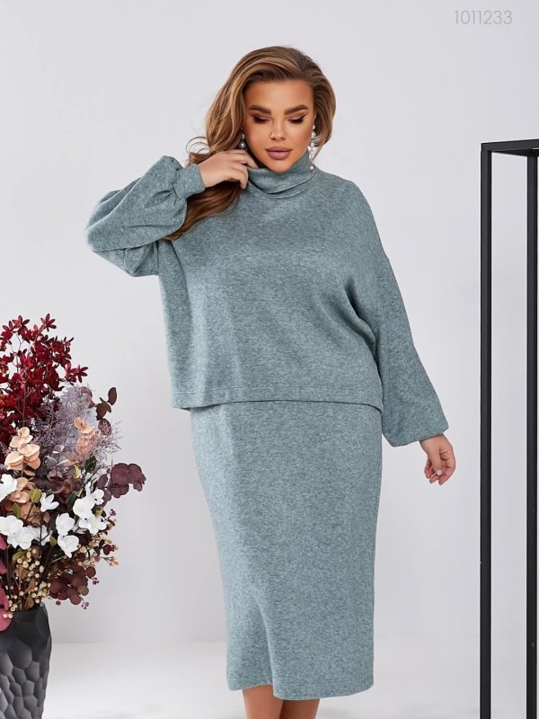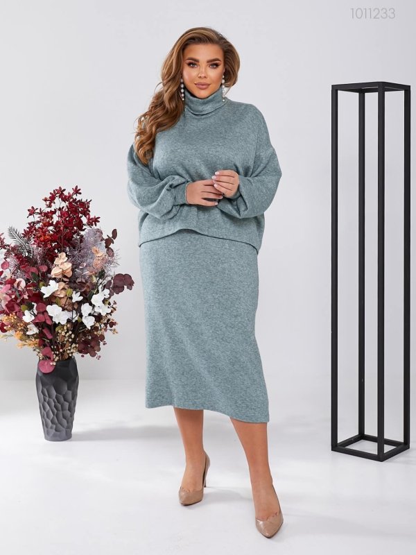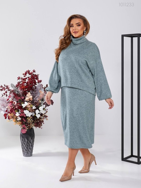 Подробиці: сукня довжиною міді прямого силуету. Светр з високим горлом та об'ємним рукавом на манжеті.