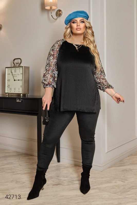 Костюм жіночий з лосинами. М'яка, приємна на дотик тканина гарної розтяжності. Рукава - шифон. З боків розрізи. Лосини високої посадки, пояс на гумці.