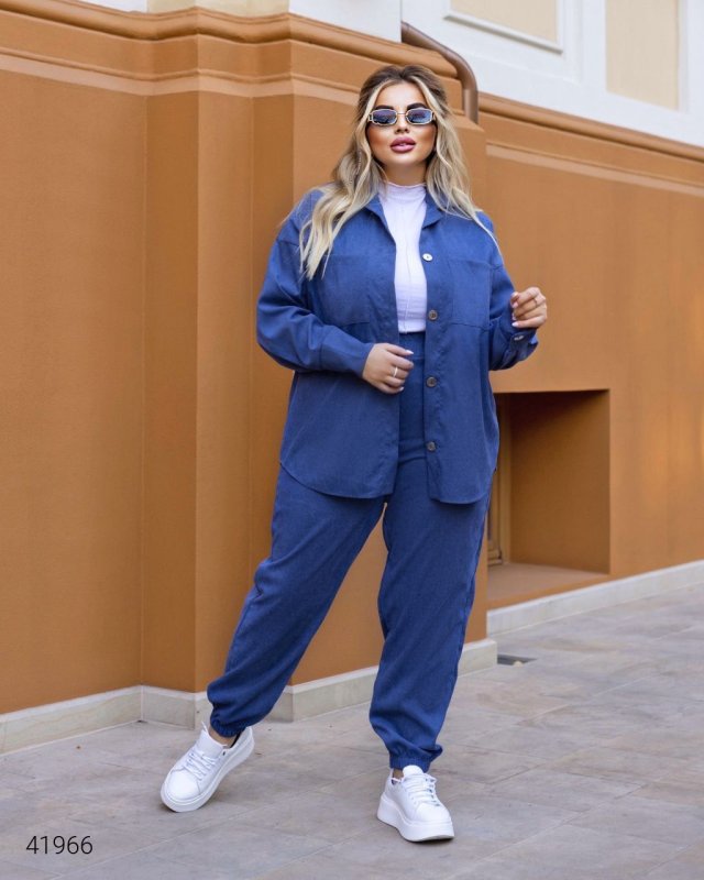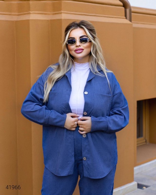 Жіночий костюм великих розмірів. Штани на резинці, повна посадка, сорочка на гудзиках (можна носити під майку в розтегнутому варіанті). Тканина: мікро вельвет.
