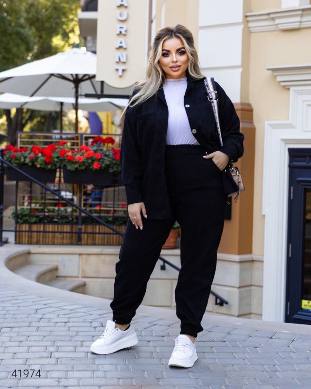 Жіночий костюм великих розмірів. Штани на резинці, повна посадка, сорочка на гудзиках (можна носити під майку в розтегнутому варіанті). Тканина: мікро вельвет.