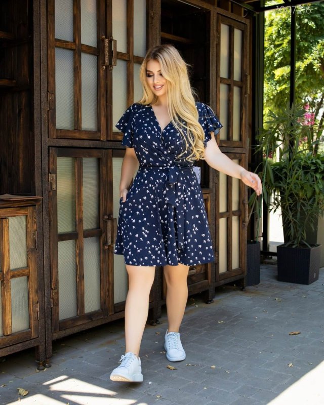 Деталі: А-силует, глибоке декольте, короткий грайливий рукав, відрізна лінія талії, пишна спідниця-шорти з кишенями в бічних швах, пояс вшитий.