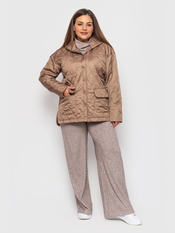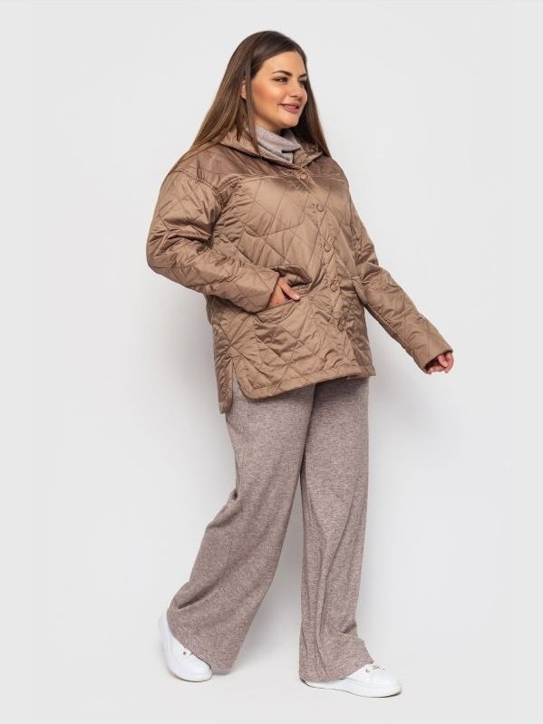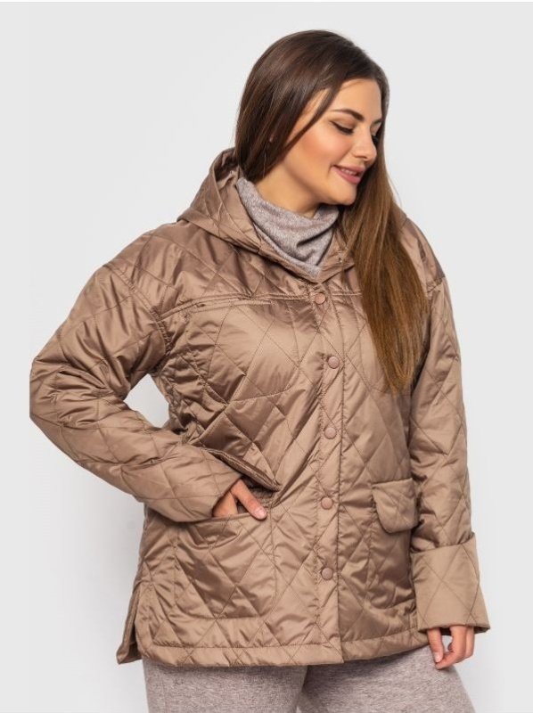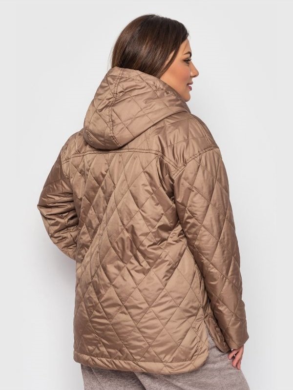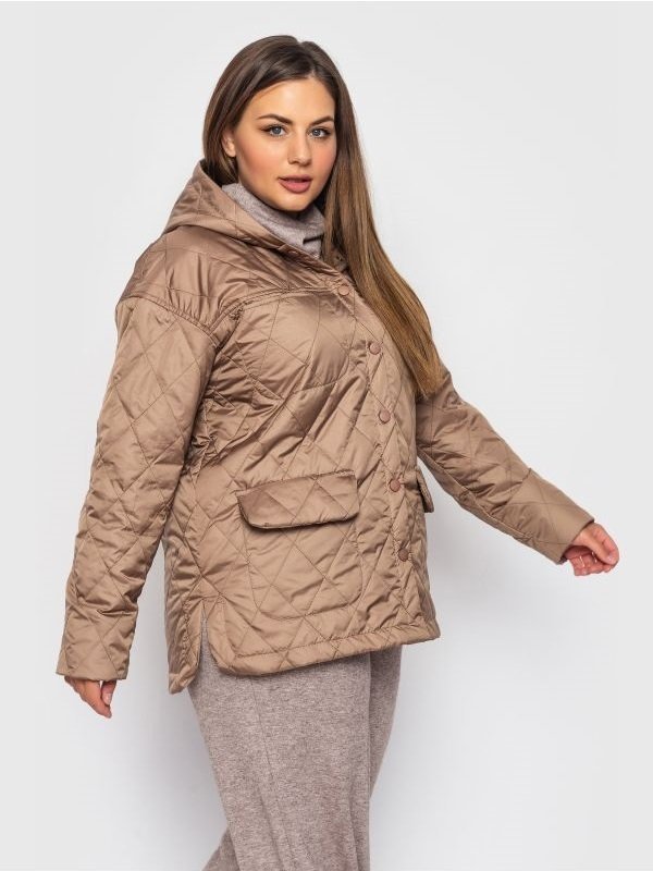 Утеплена куртка вільного крою з капюшоном. Модель застібається на кнопки, пофарбовані в тон основного матеріалу. Вгорі прорізні кишені, внизу кишені з клапанами. Спинка злегка подовжена, по бічних швах розрізи.