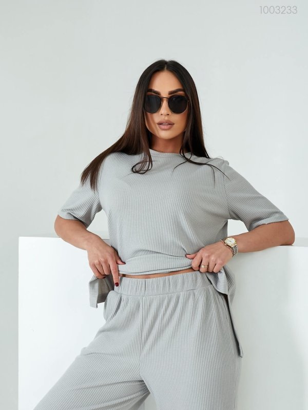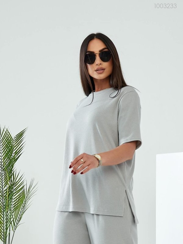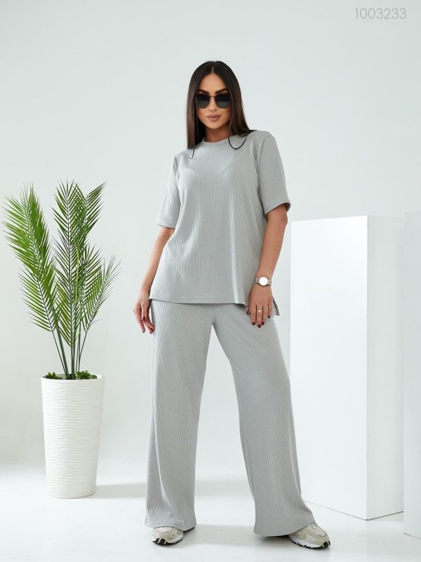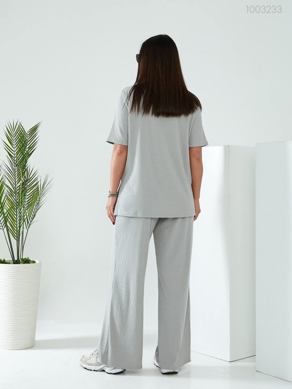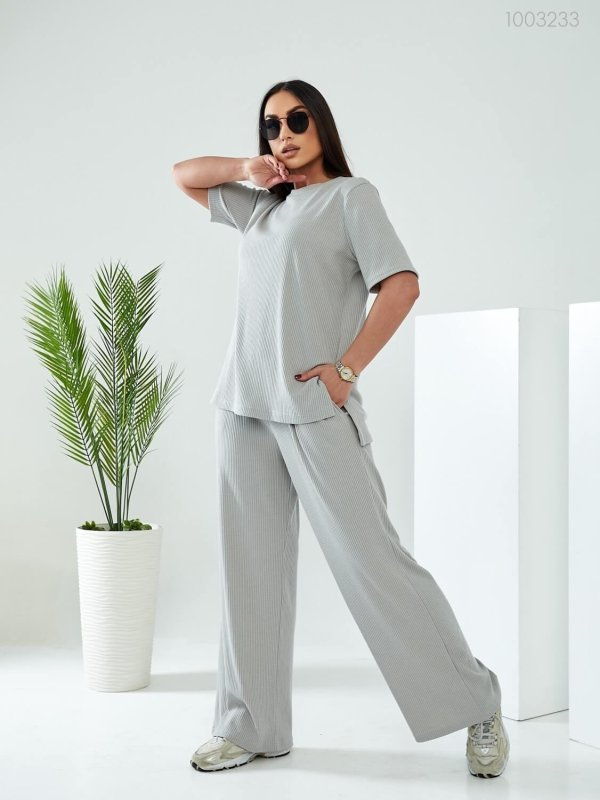 Деталі: довга футболка вільного крою з округлою горловиною та рукавом до ліктя. Штани-палаццо на широкій гумці, з глибокими кишенями.