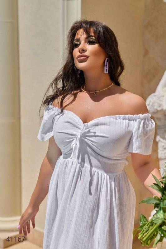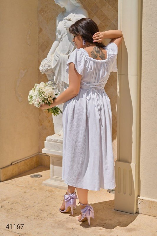 Літня однотонна сукня. Сукню можна моделювати: мотузочки, розташовані в районі грудей, можна зав'язати бантиком або зробити виріз декольте глибшим. Позаду шнурівка – регулює приталеність. Тканина: муслин жатка.