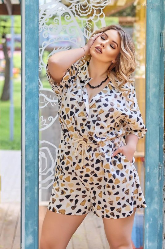 Деталі: прямий силует, застібка на гудзики, відкладний комір, короткий рукав з манжетом, нагрудні кишені, занижену талію регулює шнурок, шорти з кишенями та широким підгином.