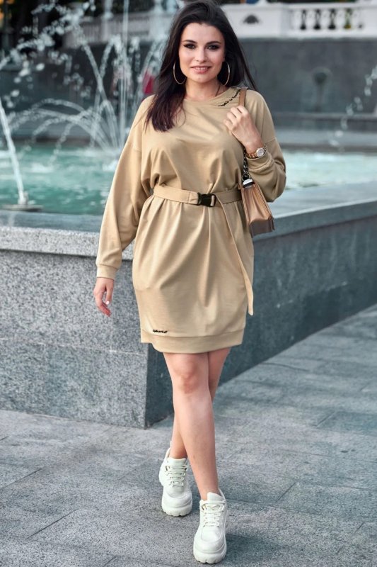 Молодіжне плаття з вільним, звуженим донизу фасоном. Підкреслити лінію талії допомагає знімний текстильний пояс із пряжкою. Внизу сукні йде манжета, а збоку розташовані зручні кишені. Модель прикрашена вишивкою та має стильні довгі приспущені рукави.