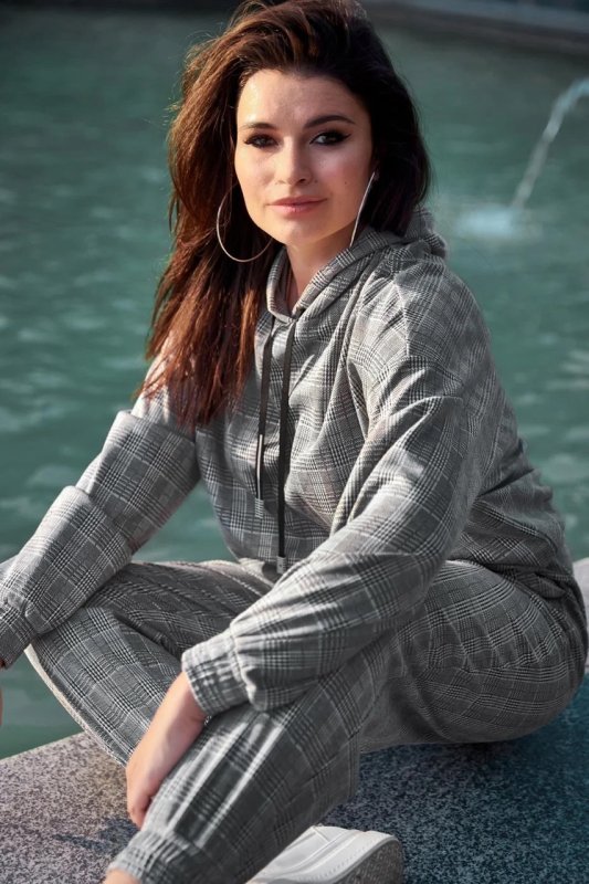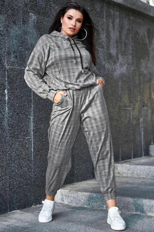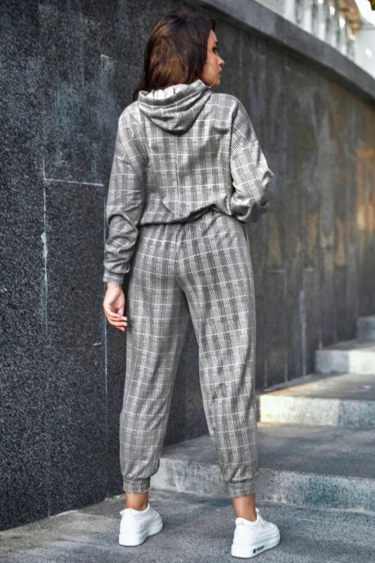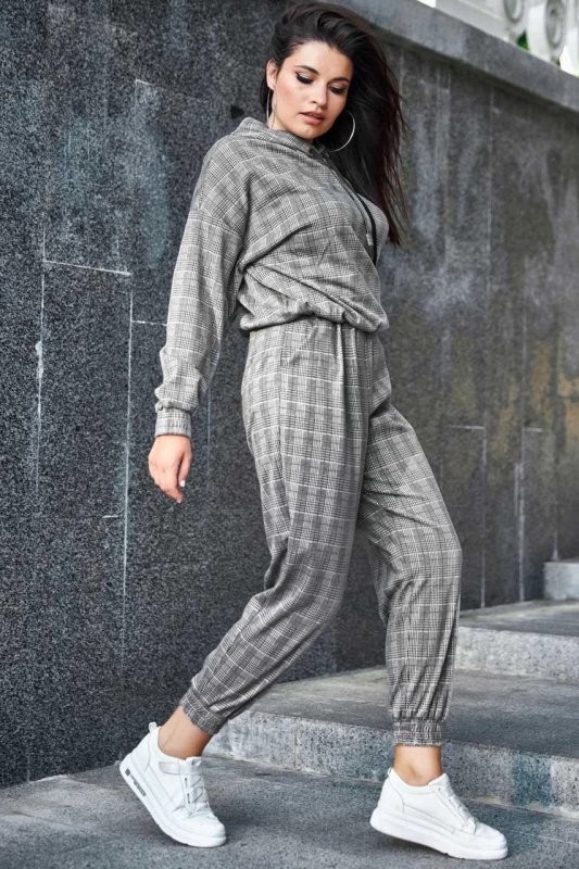 Молодіжний костюм у клітку зробить образ будь-якого сезону цікавим і незабутнім. Модель складається з широких штанів з високою посадкою та звуженими до низу. Верхня частина костюма представлена вільною кофтою з капюшоном, шнурками та хольнітенами. Наші дизайнери використовували костюмну тканину-стрейч, яка максимально зручна у даній моделі.