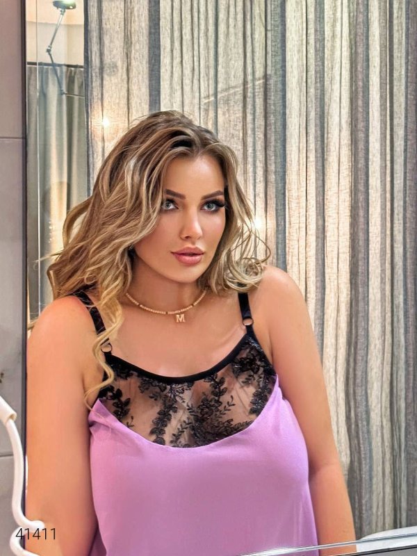 Нічна сорочка жіноча. Класична нічна сорочка, на регульованих бретелях. Попереду декорована сіточним мереживом, по низу - мереживо-війка. Тканина: креп шифон, дуже легка і приємна до тіла. Склад: поліестер - 95%, бавовна - 5%.