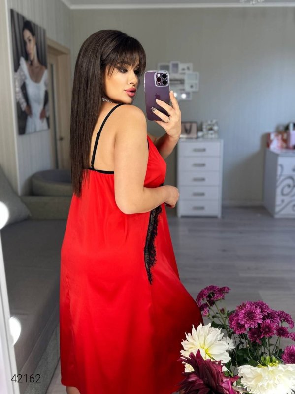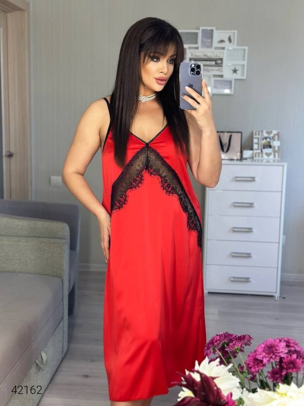 Нічна сорочка жіноча. Класична нічна сорочка на регульованих бретелях, довжина нижче коліна, попереду вставка декоративним французьким мереживом.