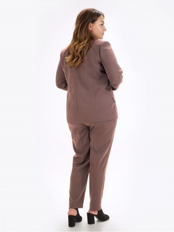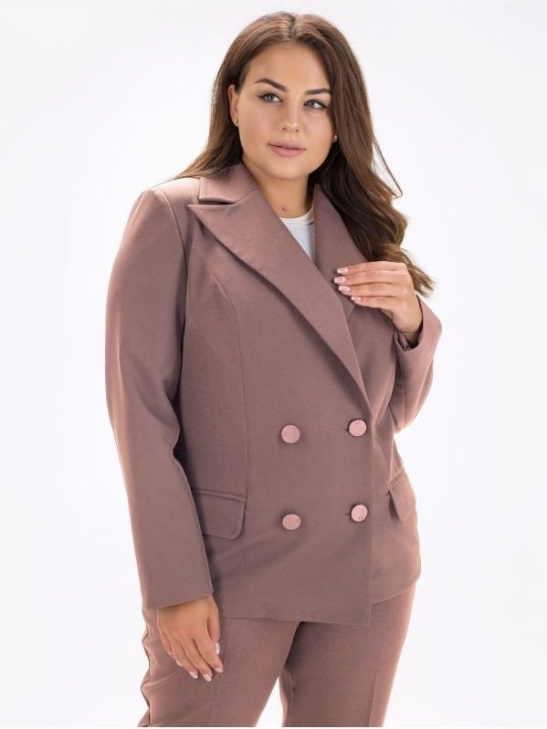 Класичний двобортний піджак на підкладці злегка прилеглого силуету. Моделюючі вставки на плечах, загострені лацкани, відкладний комір. Ґудзики в тон виробу. Кишені з клапанами.