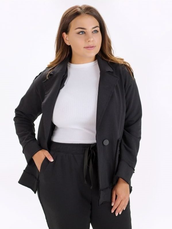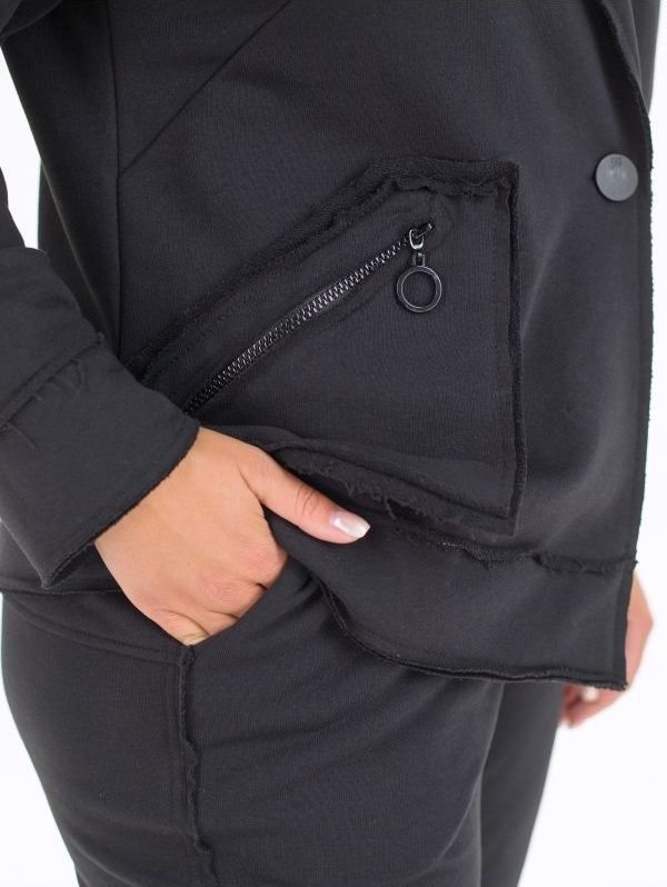 Однобортний жіночий піджак Брендон злегка прилеглого силуету. Відкладний комір, лінія плеча оброблена швом з відкритим зрізом. На бортах накладні кишені, оформлені широкими блискавками. Загострені лацкани, необроблені краї. Застібається на гудзик.