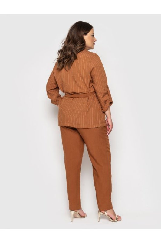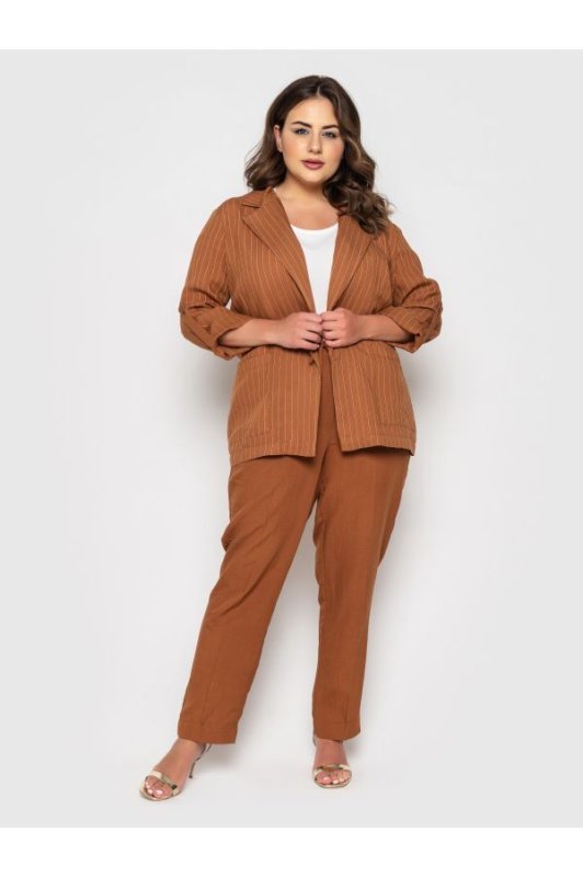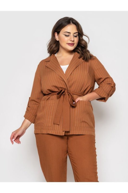 Піджак у вертикальну смужку візуально робить силует стрункішим. Крій вільний. Рукава довгі, модернізуються в 3/4 за допомогою хлястика і гудзики. Накладні кишені з боків.