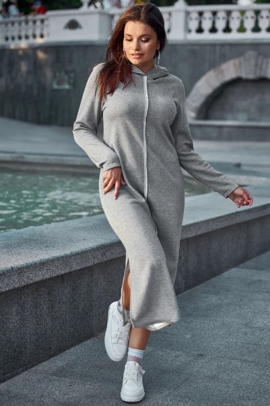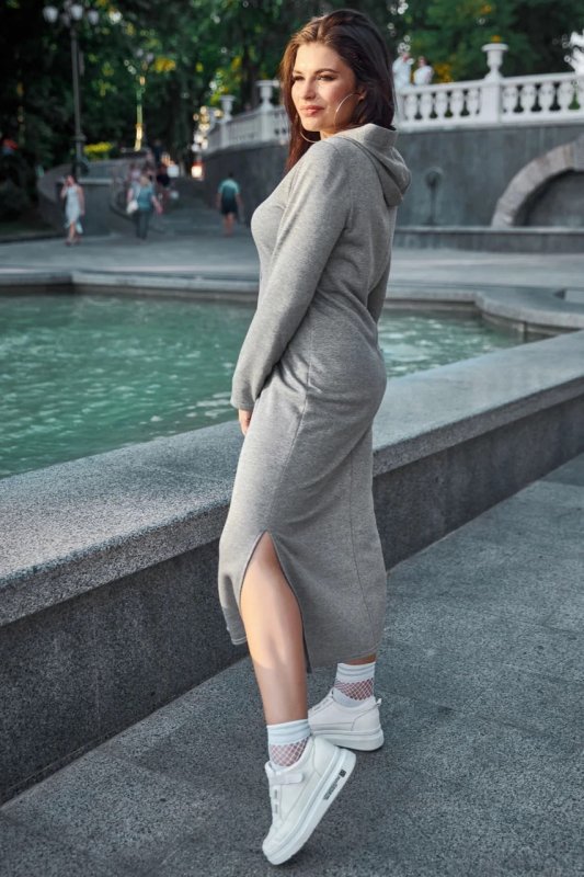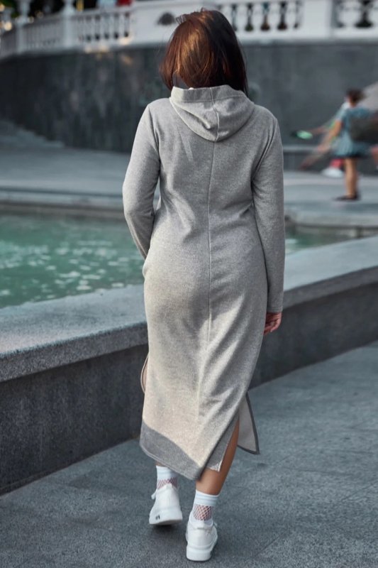 Сукня з колекції Goodbye summer plus size - стильне вбрання, яке підійде для спортивного чи повсякденного образу. Вільний напівприталений фасон не обмежує рухів, але в той же час робить вигідний акцент на перевагах фігури. Незвичайний декоративний прийом – оригінальні шви, що знаходяться на лицьовій стороні виробу. Довга сукня доповнює капюшон та бічні розрізи в нижній частині.