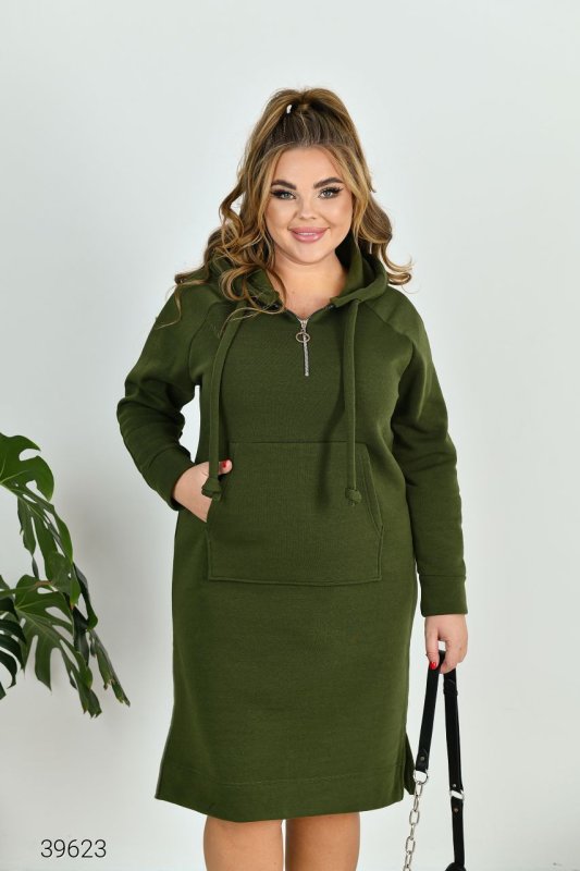 Сукня-худі великих розмірів. Тепла сукня в спортивному стилі з капюшоном, в куліску простягнутий шнур із основного матеріалу. На передній поличці кишеня "кенгуру". Знизу з обох боків невеликі розрізи.