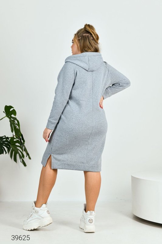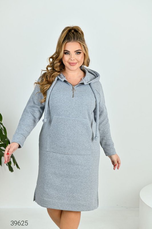 Сукня-худі великих розмірів. Тепла сукня в спортивному стилі з капюшоном, в куліску простягнутий шнур із основного матеріалу. На передній поличці кишеня "кенгуру". Знизу з обох боків невеликі розрізи.