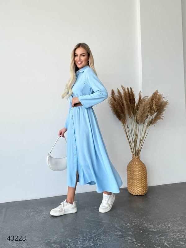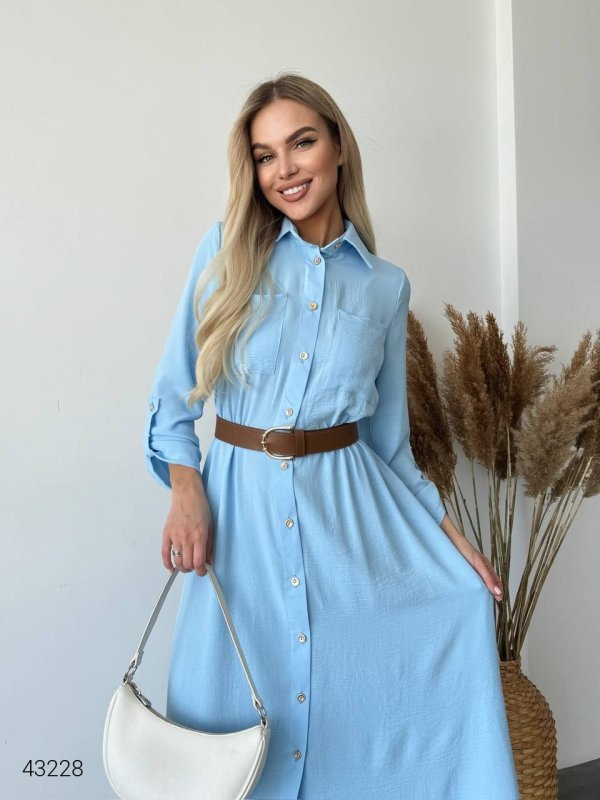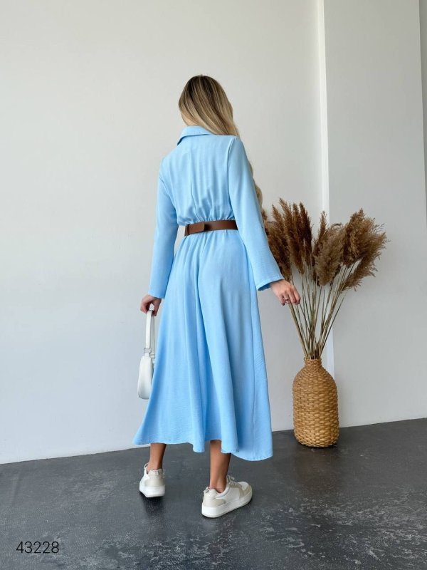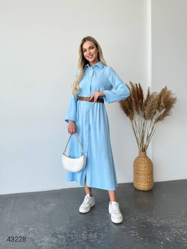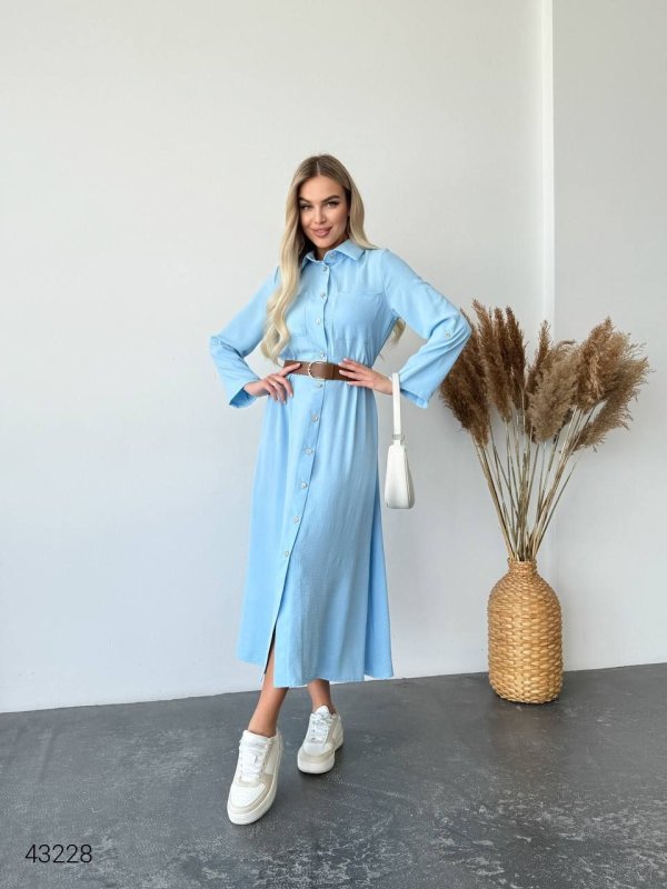 Сукня міді з гудзиками. Пояс у комплекті. Сукня з довгим рукавом, який можно регулювати. Застібається на ґудзики. Талія на резинці, за рахунок чого ідеально сідає по фігурі. Накладні кишені. Можно носити під різне взуття та вдягати на будь який випадок.